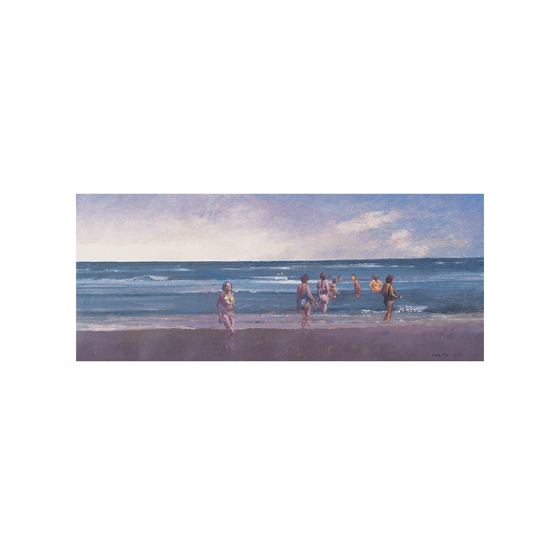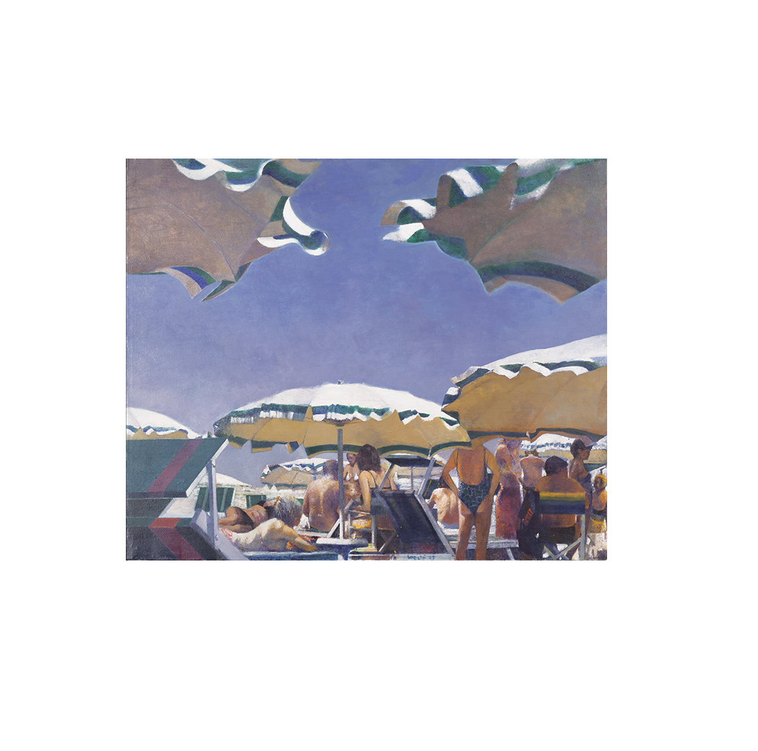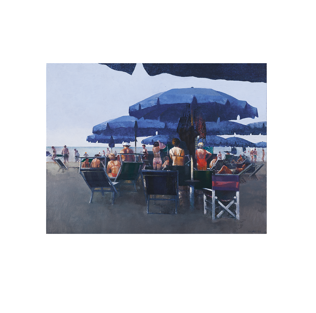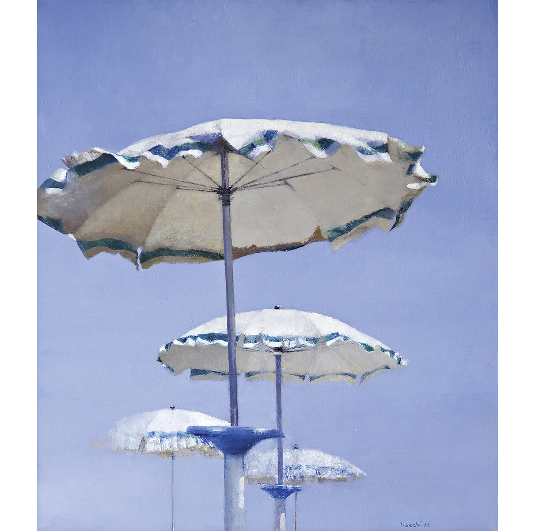 In fact, his son Alberto said: “If in his work some thematic choices – as in the case of footballers or musicians – arise from an evident passion for the subject, the same cannot be said of the cycle of beaches. Few things were as unpleasant to him as our stays in the Riviera: he hated being in the sun, he did not set foot in the water and he hated seaside life in all its manifestations.”Yet “Boschi loved the colours of the beaches, not only those dictated by nature as a transparent background, or suggested by the vermilion atmosphere of a waning sun. He was attracted by the marks distributed by man: the succession of sheds, the alluring waving of beach towels, the clusters of umbrellas, a counterpoint of shadows stretching in the lazy geometry of the paths on the beach. The painter did not visit beaches, he did not experience them as a swimmer. He just watched them […] Boschi saw the beach with a certain fascination perhaps because it offered the possibility of adding more vivid colours to the measure of one’s time.” Franco Basile, from “Il Resto del Carlino”, September 2005.