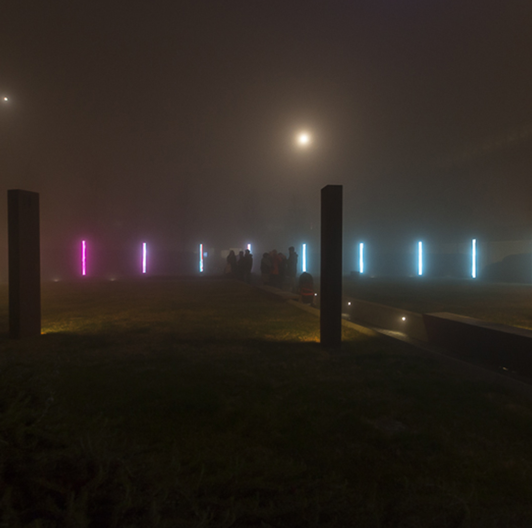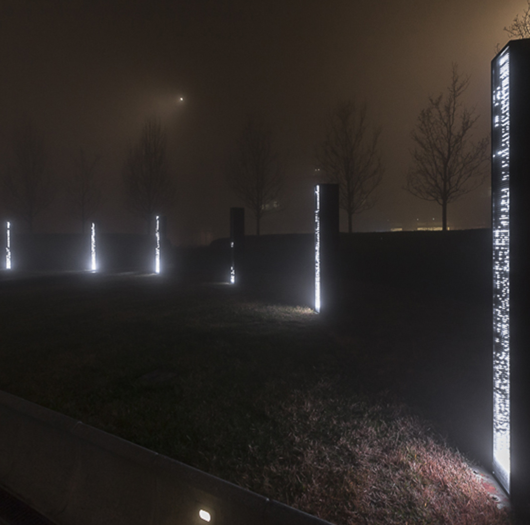 fuse*, Media Garden, 2013, environmental installation with .amygdala translated into sound and colour by 125,952 LEDs from the 41 high-brightness, real-time RGB LED Columns. Artistic heritage of the Unipol Group. Credit ph. Marco Mioli.