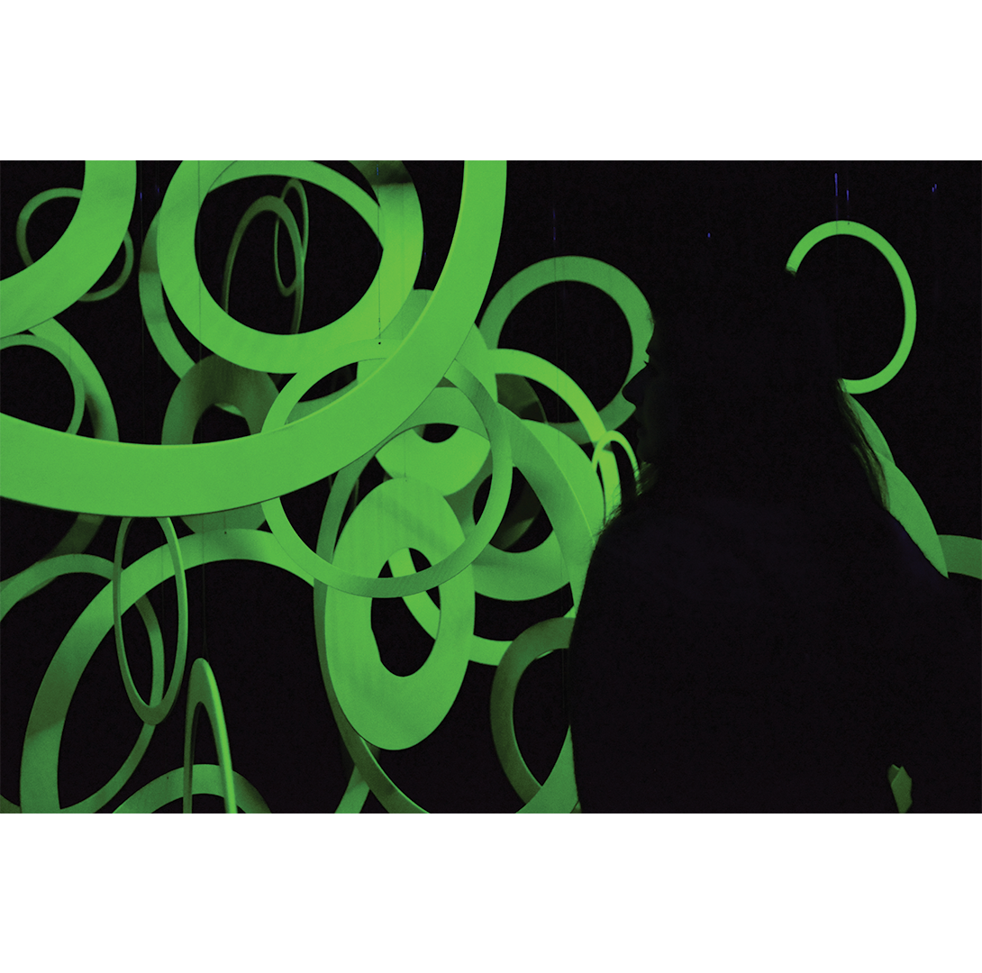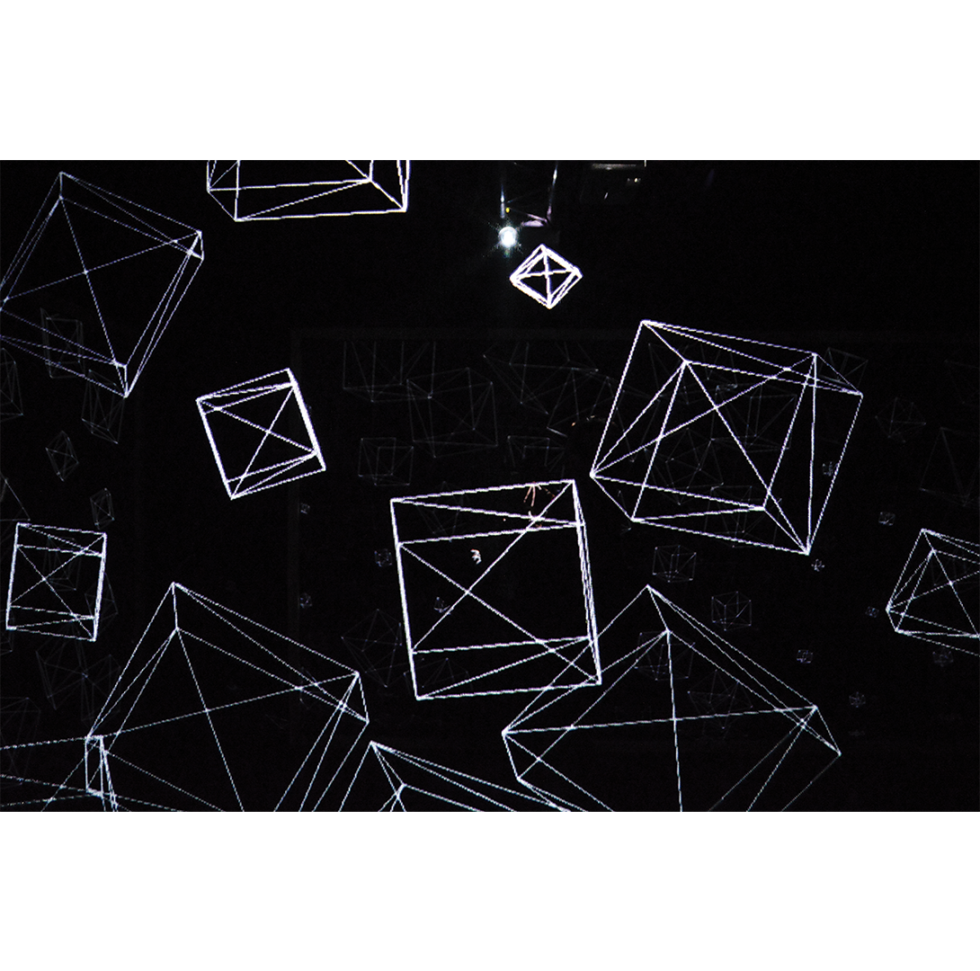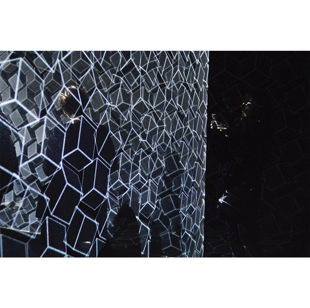 In the darkness that envelops the Spazio Arte of CUBO and welcomes visitors, we find Interfiore by Paolo Scheggi and plans by Joanie Lemercier. The first reveals itself in its more than ninety circular shapes painted fluorescent yellow, immersed and suspended at different heights in a space darkened and illuminated by wood light, they seem to float and become contaminated in a path of light. The second allows for an ephemeral and immersive experience capable of describing space through dynamic projections of light, layered surfaces, reflective or semi-transparent materials, following a rigorous geometric composition of space. A reboot built according to the typical styles of the French artist, who loves to engage the Spatialist and Optical masters using the technological tools of contemporary times. The work is physically composed of very light screens, tulle surfaces and wooden frames, distributed and suspended in the Spazio Arte of CUBO as minimal, almost spectral, installations.