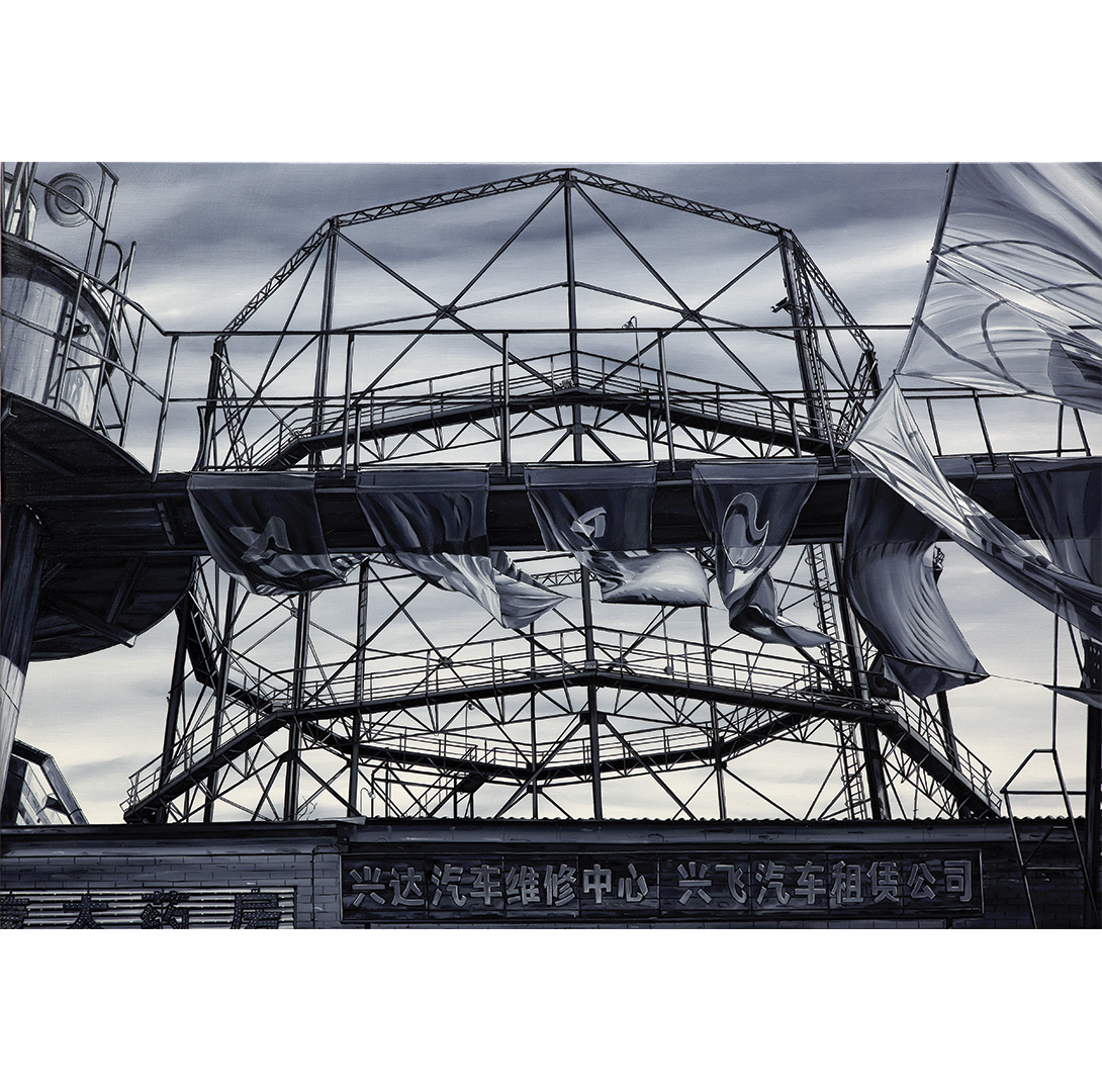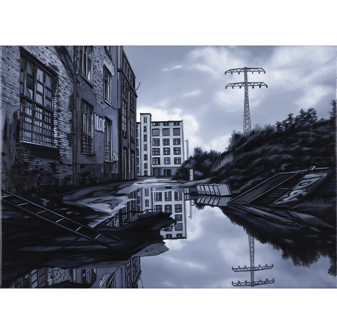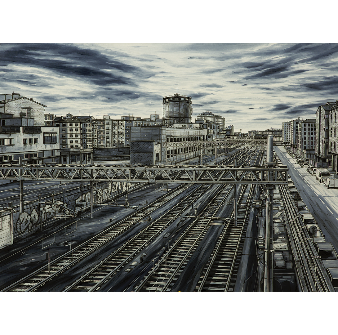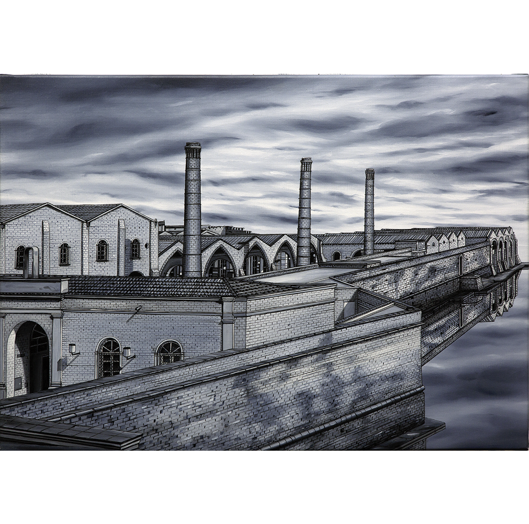Residential and commercial buildings, factories, gasometers, roads and bridges shape the visual field of Andrea Chiesi’s paintings, while the succession of geometric volumes and the continuous openings and closures of visual perspective mark the rhythm of observation. The stylistic elements that distinguish the artist’s works are theprevailing black and white and the particular shade of grey that determine the cold, metallic light of the paintings, togetheralong with the study of contrasts, mirroring and reflections.