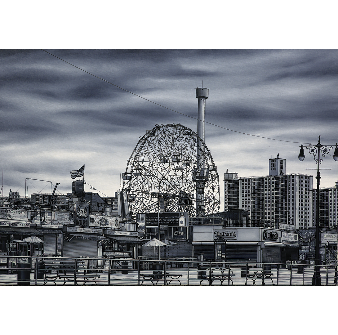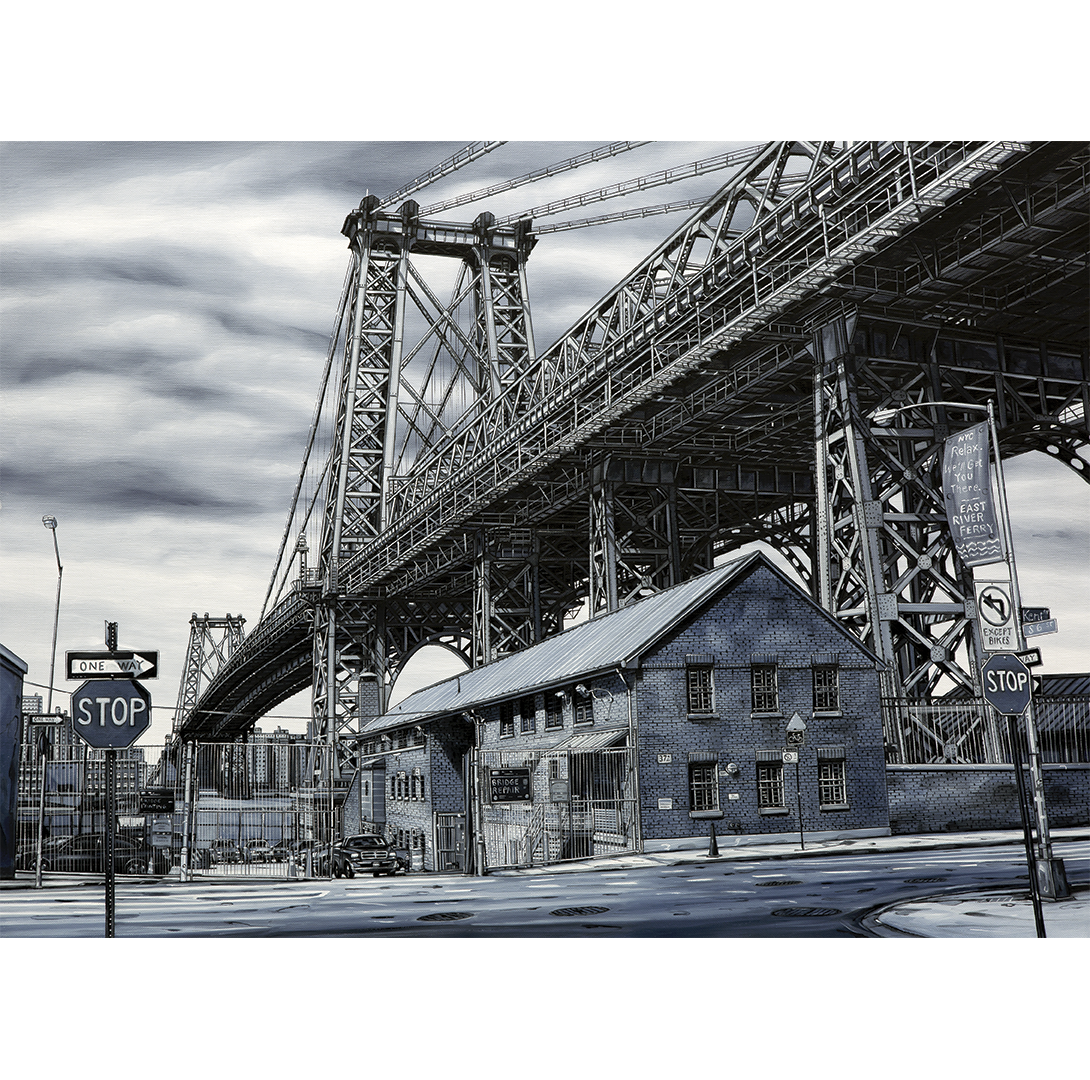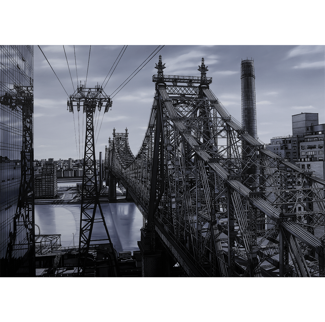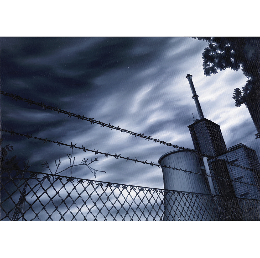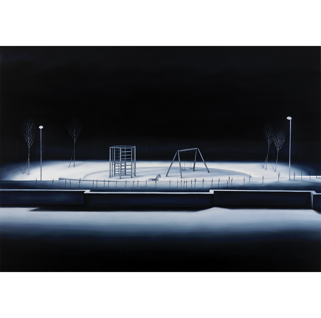 Residential and commercial buildings, factories, gasometers, roads and bridges shape the visual field of Andrea Chiesi’s paintings, while the succession of geometric volumes and the continuous openings and closures of visual perspective mark the rhythm of observation. The stylistic elements that distinguish the artist’s works are theprevailing black and white and the particular shade of grey that determine the cold, metallic light of the paintings, togetheralong with the study of contrasts, mirroring and reflections.