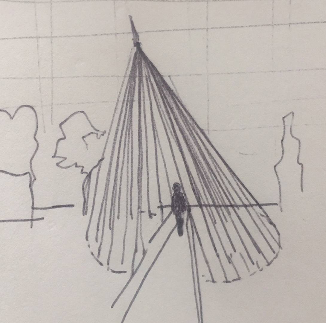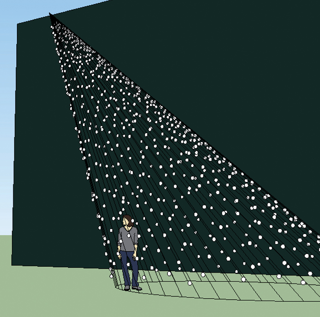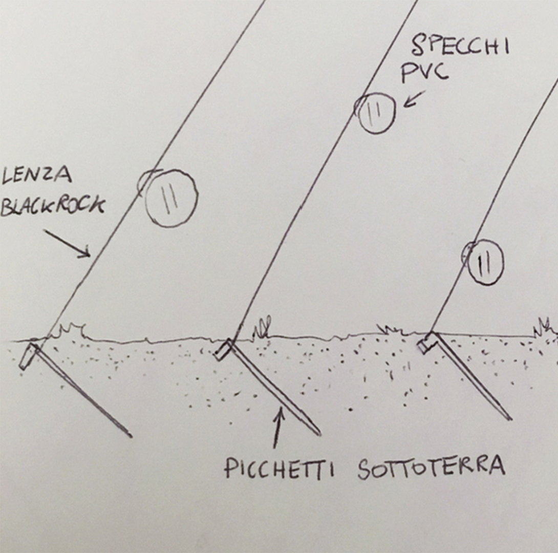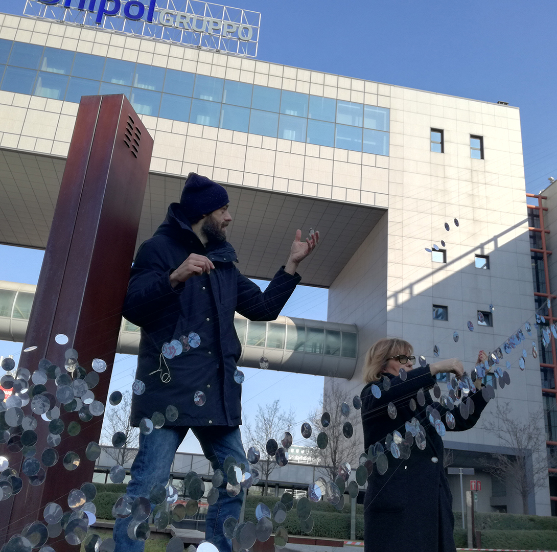 L’installazione di grandi dimensioni, presentata nel giardino pensile che abbraccia gli spazi di CUBO, si estende dai piani alti dell’edificio al verde del giardino e dà vita a un suggestivo ambiente da attraversare. L’opera è formata da un grande cono di lenze speciali alle quali sono ancorati dei piccoli frammenti specchianti, riflettenti, sottili e leggeri, realizzati di PVC e inseriti dentro la lenza tramite un sistema di auto ancoraggio scorrevole che permette di determinare e modulare le diverse altezze; non sono taglienti e pesano un grammo l’uno così da accogliere la giusta sensibilità al vento e permettere il mutare del movimento con l’incidenza dell’aria e della luce naturali. L’opera riflette la luce in modo brillante quando il sole è nel suo punto più alto, ammorbidendosi gradualmente col calare della notte. L’osservatore è immerso in un universo onirico: avvicinandosi all’opera il visitatore affronta le diverse prospettive immerso nei lampi di luce e nell’ondeggiamento degli specchi nel vento.