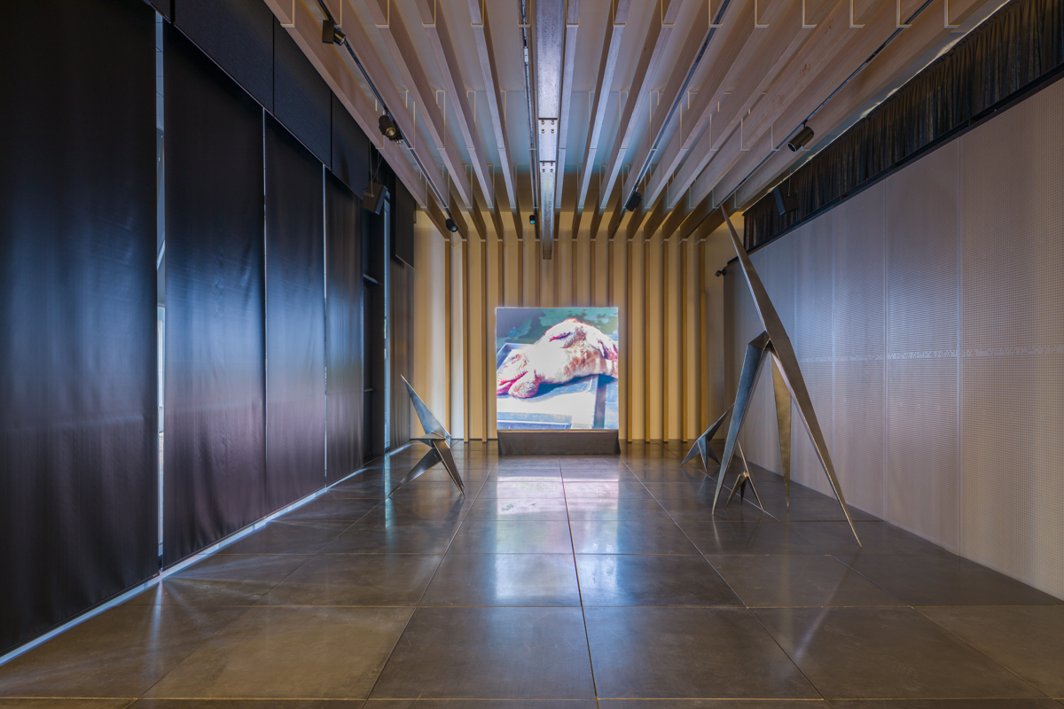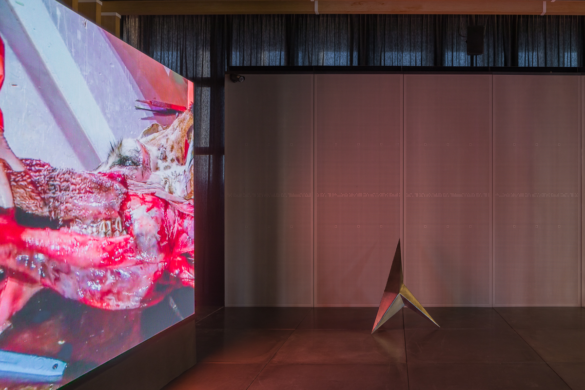Presso la sede di CUBO in Porta Europa viene presentata una riflessione sull’idea di museo e di musealizzazione postumana. Giraffa con giraffine cosmiche al museo terrestre rappresenta un dialogo tra un’opera video ottenuta manipolando documentari scientifici sulla vita dei più alti mammiferi viventi e un piccolo branco di animali ricreati con lamine metalliche taglienti e lucenti.