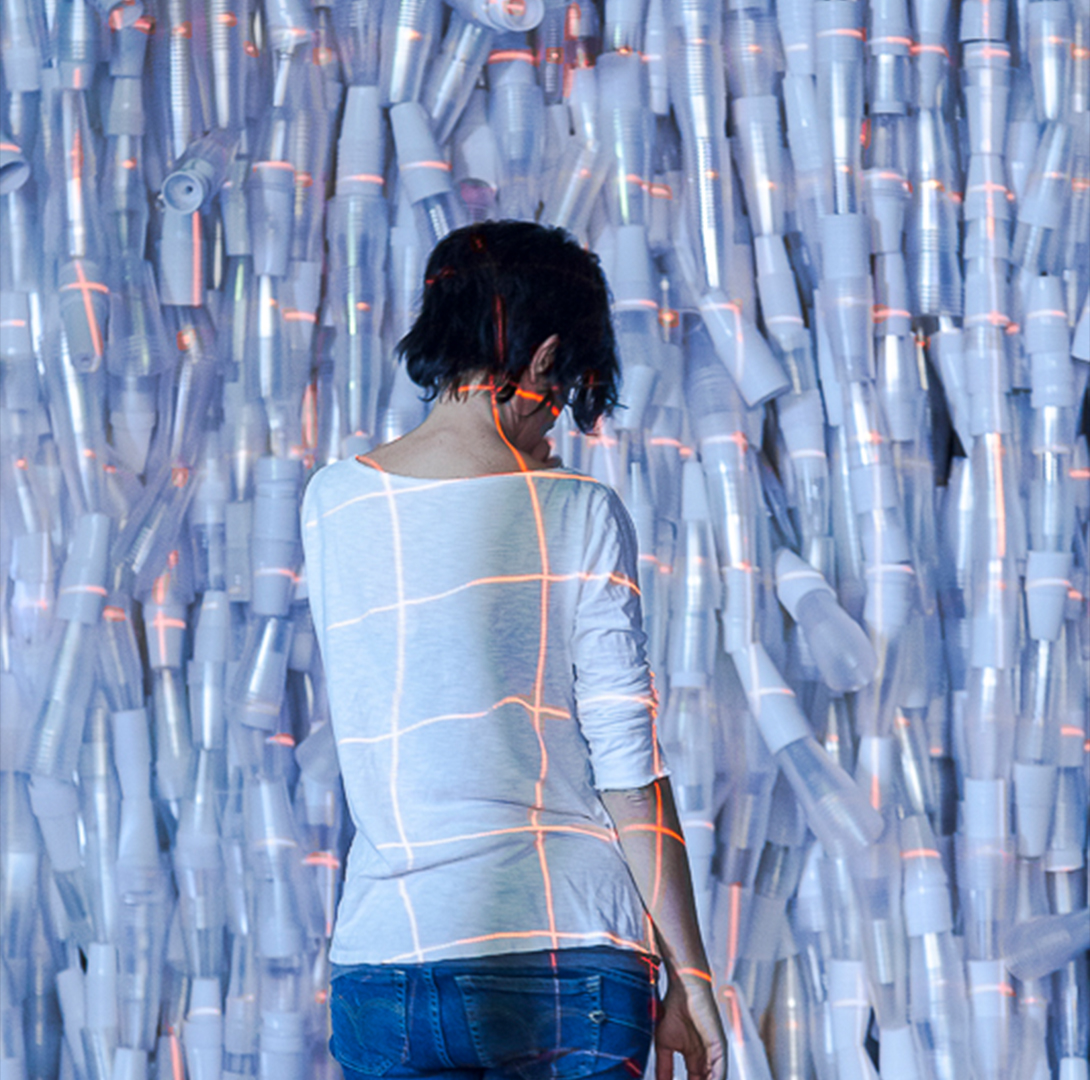 L’opera è costituita da un pattern di moduli di bicchieri in plastica impilati, che fungono da superficie riflettente e diffusiva per fasci di luce generati da un sistema di proiezione controllato da processori Kinect.L’installazione si avvale di una tecnologia di motion tracking che rileva la posizione e i movimenti degli spettatori nello spazio espositivo. I dati raccolti vengono elaborati in tempo reale, attivando una variazione dinamica di fasci luminosi proiettati sulla superficie plastica, i quali interagiscono con la struttura modulare dell’opera. Contestualmente, un sistema di sound design generativo regola l’ambiente sonoro in base ai parametri di movimento rilevati, creando una relazione sinestetica tra luce, suono e interazione del pubblico.